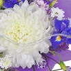 ЛЮКС: хризантема одноголовая белая - 2 шт., хризантема кустовая белая (сантини) - 5 шт., эустома фиолетовая - 4 шт., ирисы фиолетовые - 5 шт., статица - 4 шт., фетр фиолетовый.