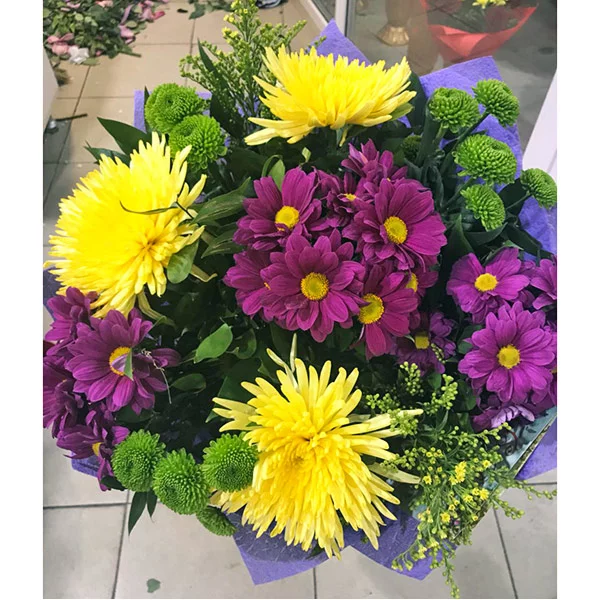 Делюкс: хризантема одноголовая (желтая) - 7 шт., хризантема зеленая кустовая - 7 шт., хризантема фиолетовая кустовая - 7 шт., солидаго - 6 шт., фетр фиолетовый, крафт, лента. Примерный диаметр букета 50х50 см.