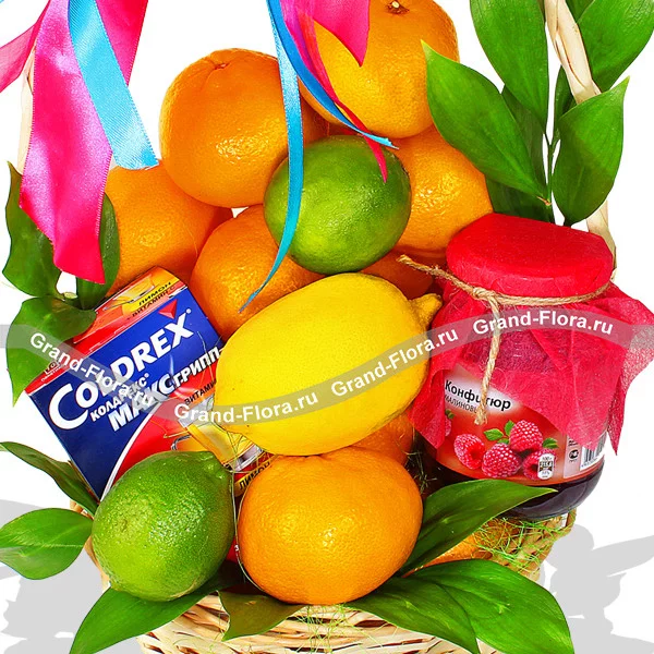 Уменьшеный: мандарины - 1 кг, лимон - 1 шт, лайм - 1 шт., Coldrex МАКС Грипп - 1 уп., конфитюр (малиновый) 310 гр. - 1 шт., корзина малая, декор.