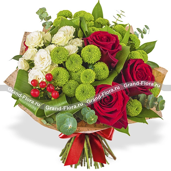 Люкс: роза красная - 5 шт., роза кустовая белая - 3 шт., хризантема кустовая зелёная 5 шт., аспидистра - 3 шт., эвкалипт - 2 шт., салал 2 шт., гиперикум - 3 шт., упаковка крафт, лента. Примерный размер: 35Х35 см.