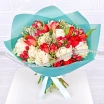 Уменьшенный: роза белая - 5 шт., тюльпан красный - 4 шт., гиперикум, лимониум, упаковка, лента. Примерный размер: 25Х25 см.